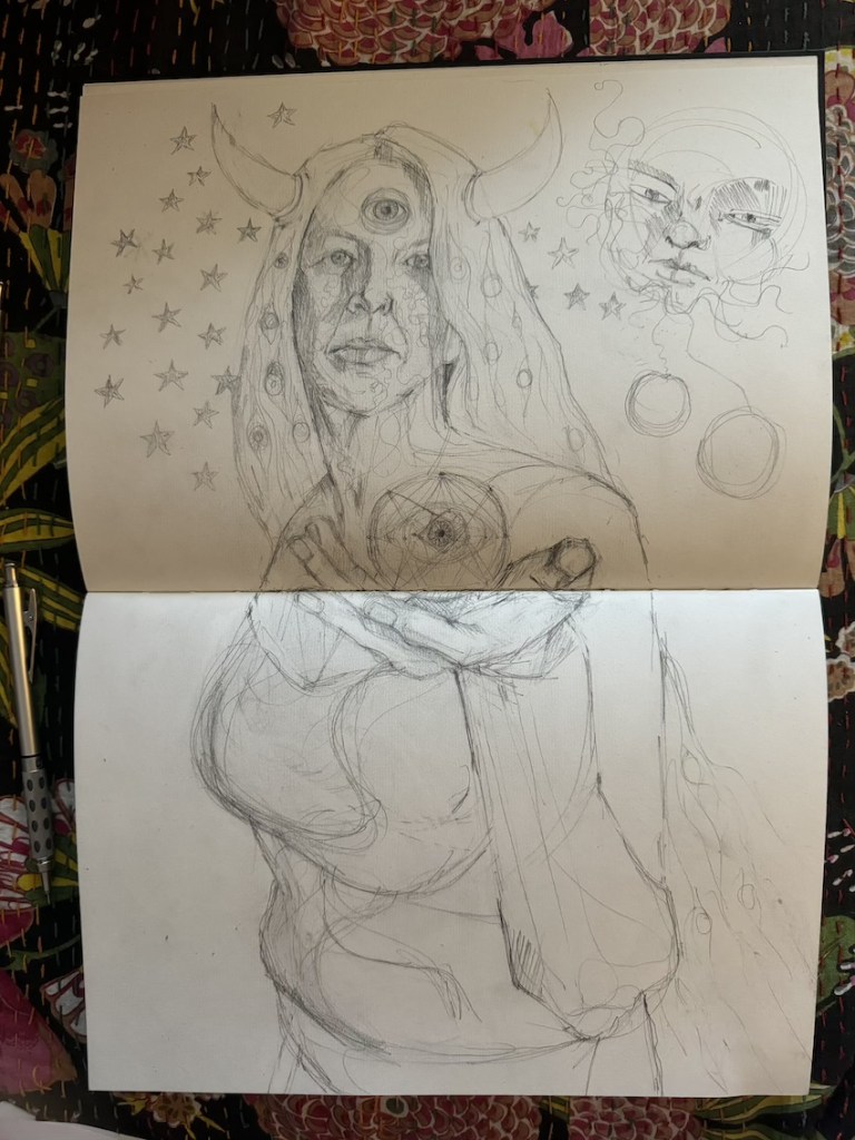 As I was also experiencing heavy bleeding and discomfort, I rested when possible. I also journaled, meditated, and spent time in the studio drawing and painting.