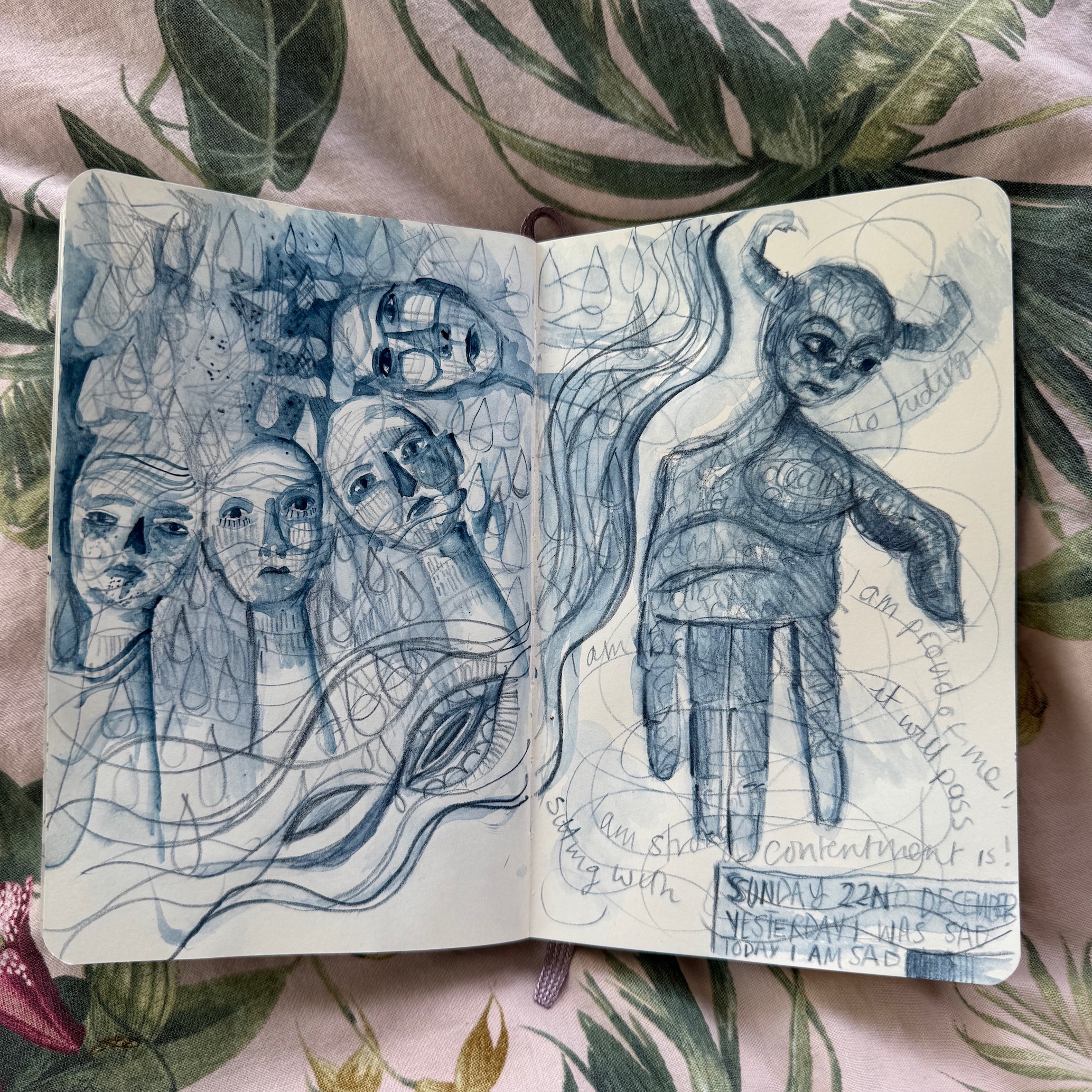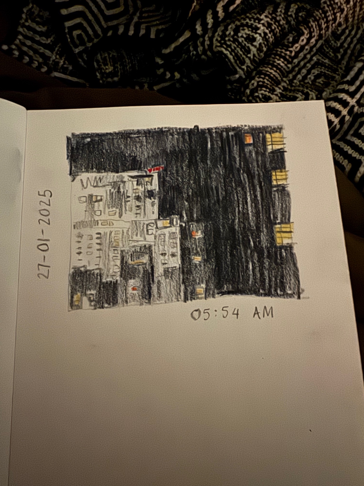 I’ve wanted to tackle the view from my window for a long time, but the sheer complexity of it has meant I only drew it a handful of times! Since my sleep pattern is all over the place, I often find myself awake at odd hours. I decided to start drawing random views out the window with coloured pencils. There’s something oddly comforting about seeing another person’s light on at 3 a.m.; it makes you realise you’re not the only one awake. I’m really enjoying these drawings. I use a limited palette of colours and dark indigo instead of black. I find it necessary to have squares to keep the drawings contained. They are created quickly and sometimes in the dim light of my phone’s torch. I have a small A5 sketchbook just for these sketches and look forward to seeing how they grow and develop over the year
