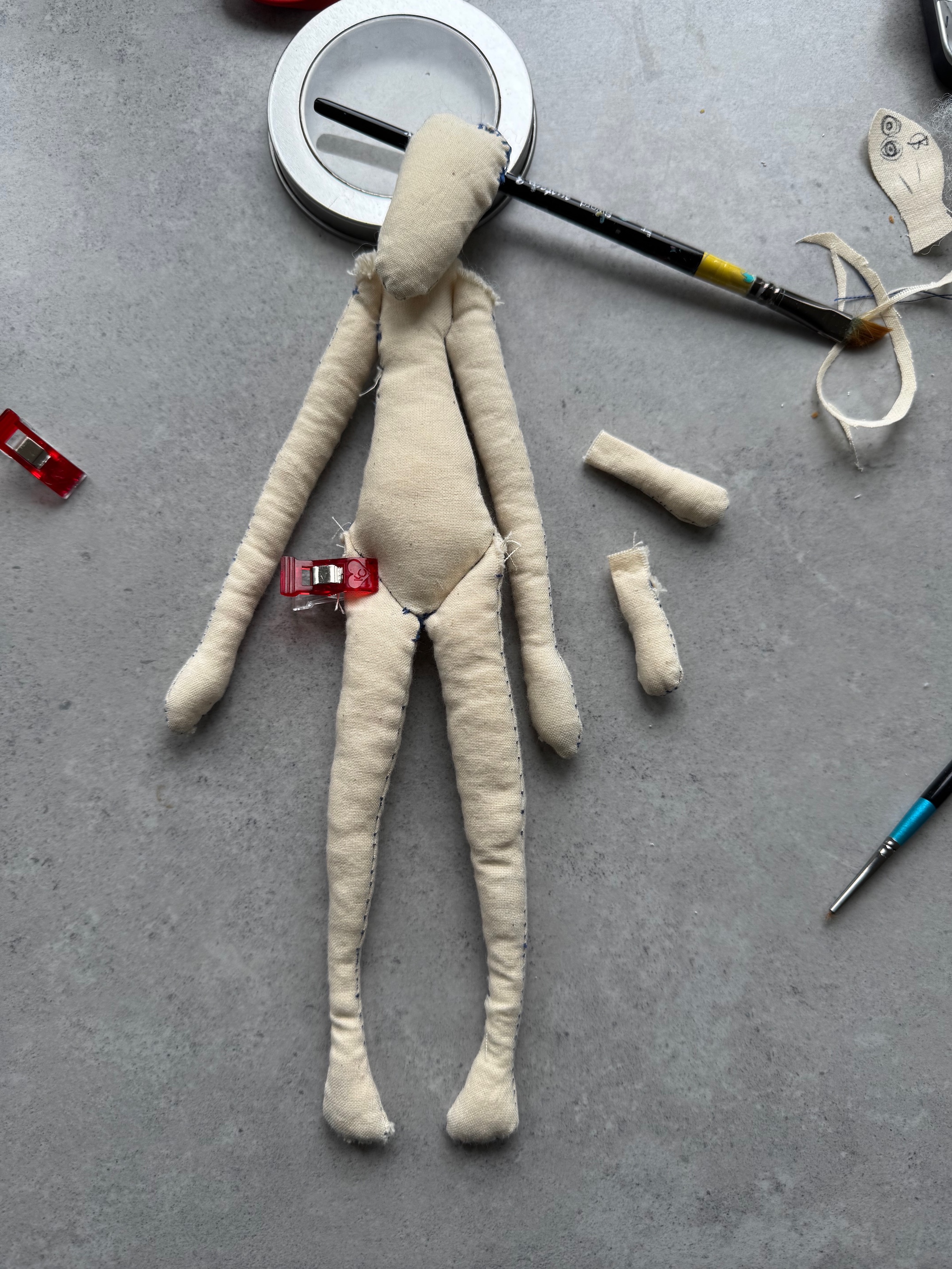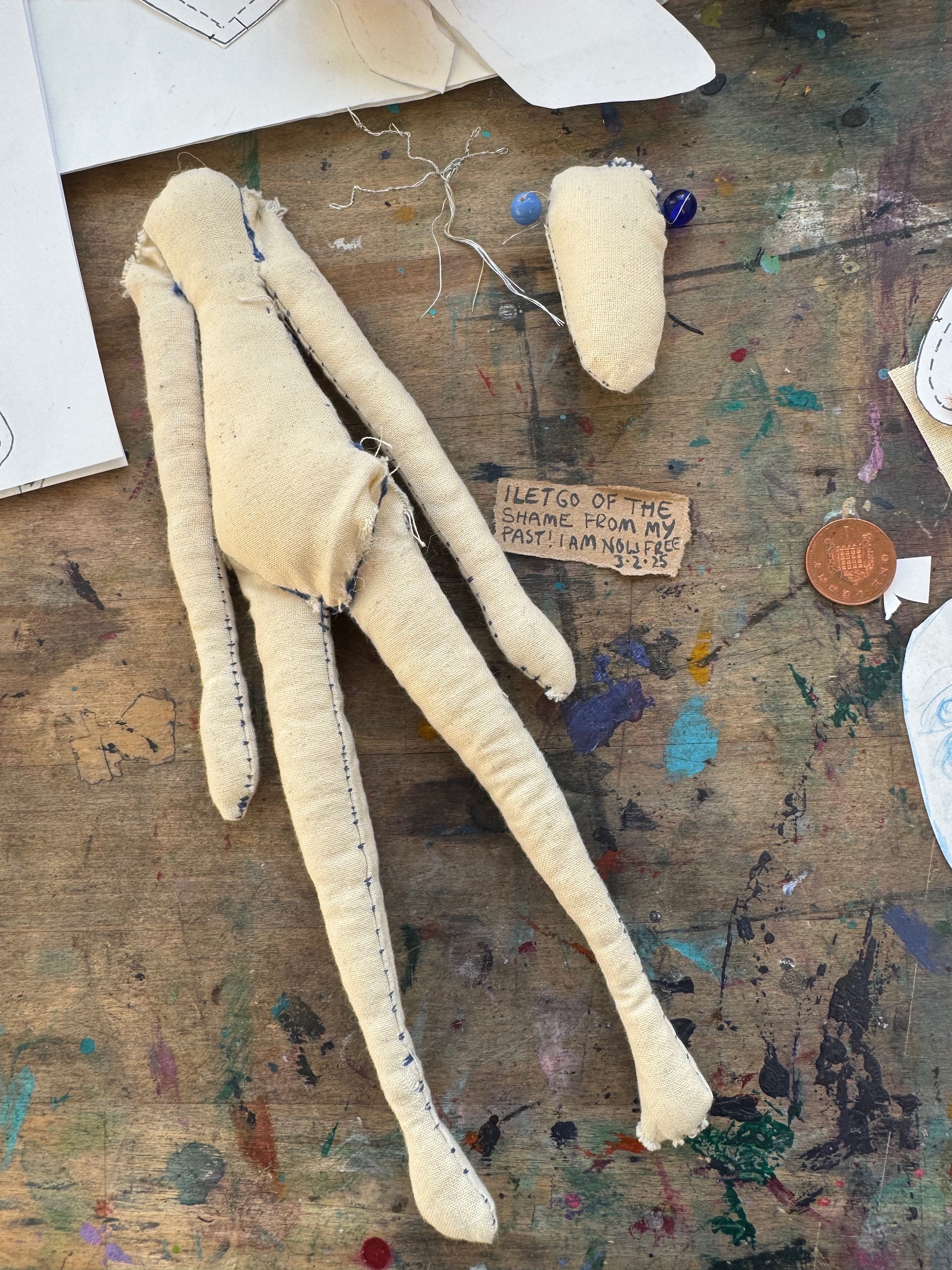 I am creating a “Shame Doll.” This is the first of three dolls I plan to make; the other two will represent Fear and Guilt, inspired by a drawing I created last summer. These dolls will be part of my final piece. Soon, I will be able to hold Shame in my hand!